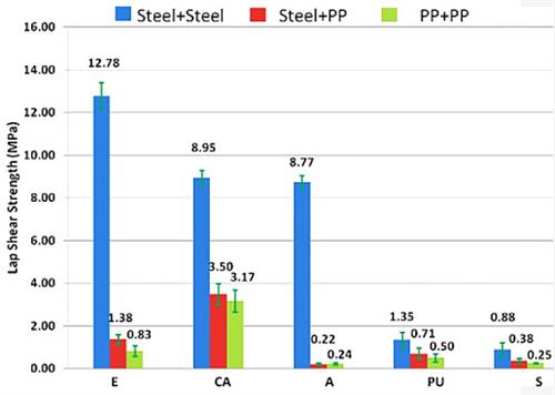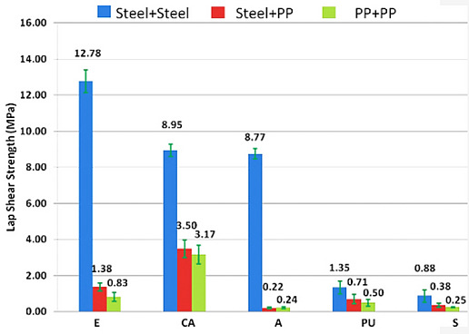 在金屬與金屬的結(jié)合中,所有的5項測試均可進行。而對于金屬與聚丙烯、聚丙烯與聚丙烯的結(jié)合,則只能進行剪切應(yīng)力測試。實驗中對每種底層材料與粘結(jié)劑的結(jié)合均準備了5個樣品。