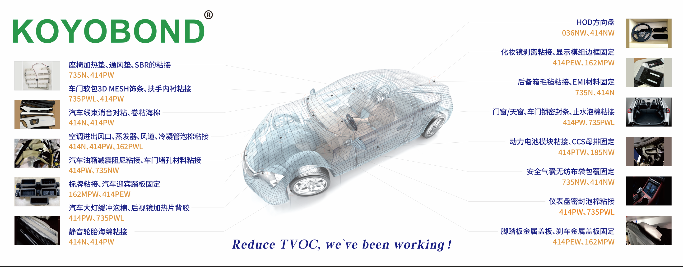 針對汽車內(nèi)外飾零部制造企業(yè)廣泛關(guān)注的低氣味低VOC問題,本次KOYOBOND推出了全新的KR-414系列膠帶產(chǎn)品,無基材雙面膠帶KR-414NW、棉紙雙面膠帶KR-414PW、PE泡棉雙面膠帶KR-414PEW、PET芯材雙面膠帶KR-414PTW等均亮相展會。在展會現(xiàn)場展示了耐溫水測試、耐反彈測試及氣味瓶讓客戶現(xiàn)場體驗我們的極致的氣味管控成果。