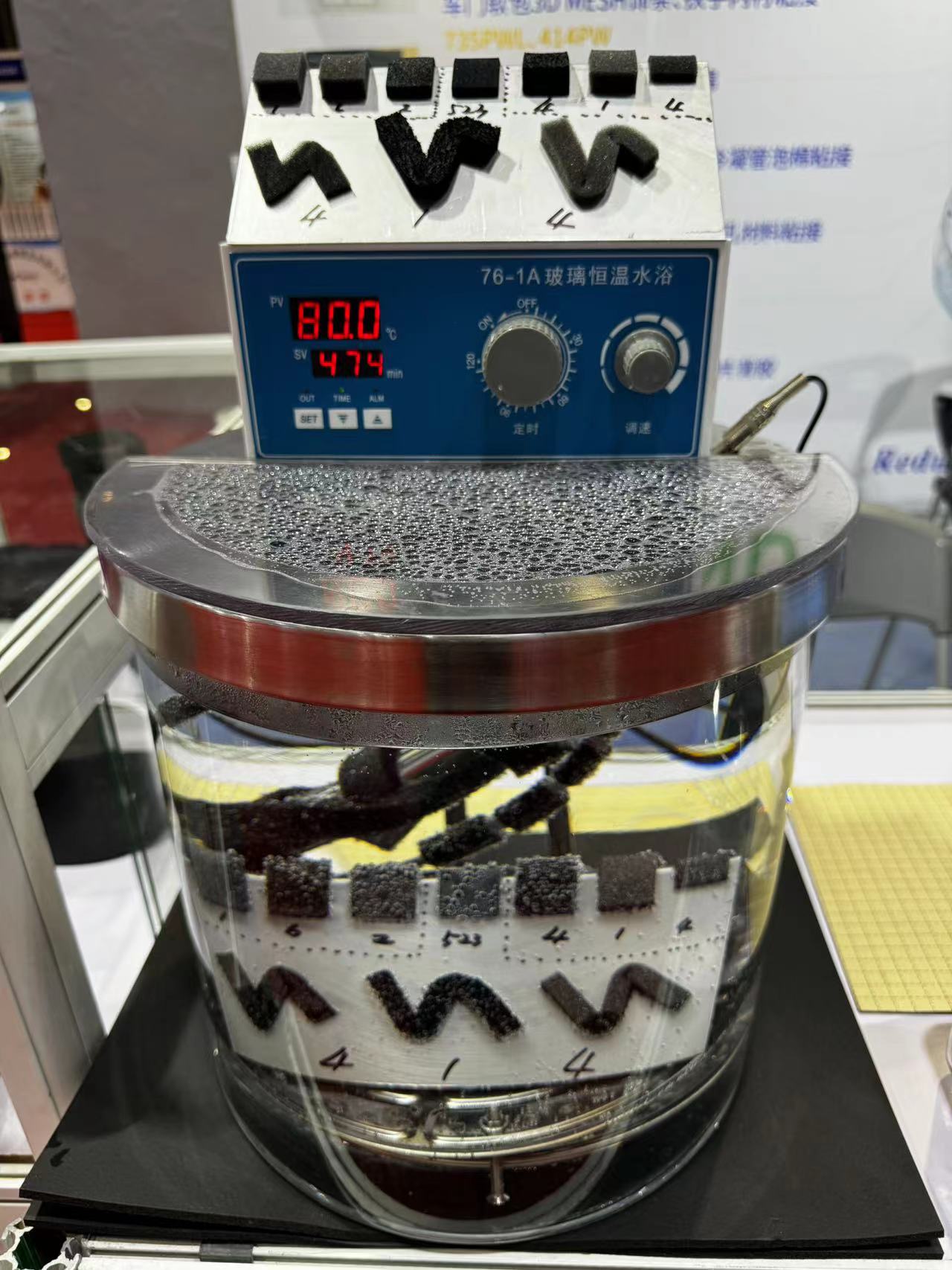 mm厚度閉孔EPDM一種),裁切成20*100mm的樣條,在90度折彎的鍍鋅鋼板上貼合24小時后,放置于玻璃水浴中,然后加水至完全淹沒樣件,將水從室溫加溫到80℃,同時我們還在玻璃水浴中放置了模擬線束海綿對粘與卷粘的樣品。一直到展會結(jié)束,展示的3天期間,除了做對比用KR-523粘貼的閉孔EPDM有出現(xiàn)脫膠以外,其它所有樣品都完好無損,完美詮釋了KOYOBOND產(chǎn)品力自信!
