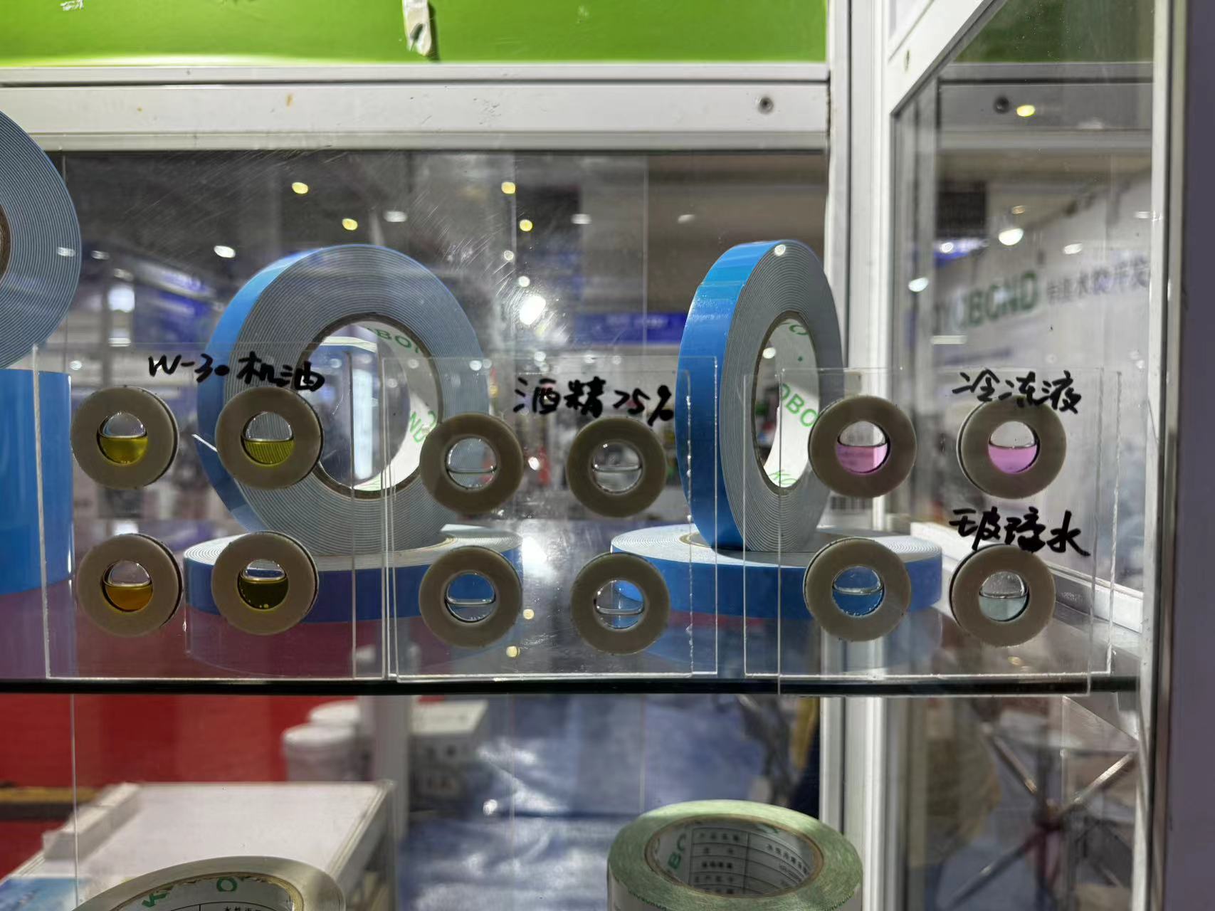 我們還展示了耐溶劑型低氣味泡棉膠帶KR-162MPW。通過把162MPW與丁晴橡膠密封墊圈兩面粘接,再分別粘接到透明亞克力板上,在中間分別加入酒精、玻璃水、機油、防凍液,觀察這些液體的滲漏狀況測試我們膠帶的耐酸堿和耐油性。因為我們強大的低VOC和低氣味、耐油和耐酸堿性,因此這款產(chǎn)品可以廣泛應(yīng)用在汽車迎賓踏板、汽車剎車及油門踏板、汽車顯示器邊框等位置,在汽車產(chǎn)品使用的長生命周期力,不用擔(dān)心粘性失效帶來的噪音及質(zhì)量客訴問題。