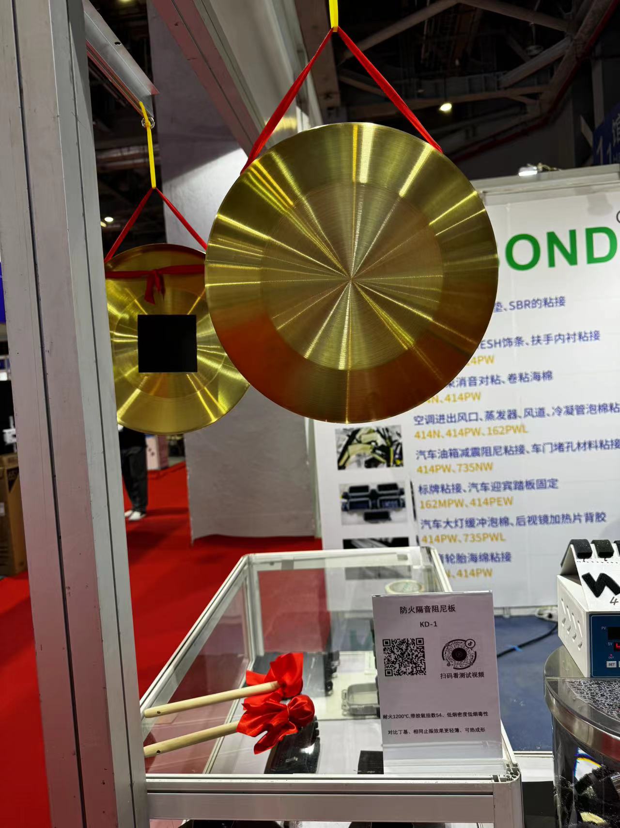 展會上也展示了我們強大的EVA阻尼片——KD-1的止振性能?,F(xiàn)場懸掛的兩只銅鑼,一只貼了1.5*120*120mm的KD-1阻尼,一只什么也不粘貼。通過鼓槌敲擊,貼KD-1阻尼的銅鑼聲音沉悶并且迅速消音,未貼阻尼的銅鑼聲音洪亮,能持續(xù)半分鐘。眾所周知聲音是由振動產(chǎn)生的,只要能消除振動就能消除聲音,1.5mm厚度的KD-1消聲效果完全超越了同等尺寸、更厚的丁基阻尼!并且不帶膠氧指數(shù)達(dá)到72、帶膠氧指數(shù)達(dá)到54;還擁有低煙毒性、低煙密度;1200℃火焰槍噴燒1分鐘也不會產(chǎn)生滴落物及被火焰穿透。所有客戶都表示,如此優(yōu)秀的產(chǎn)品,KD-1它配得上它的價格!