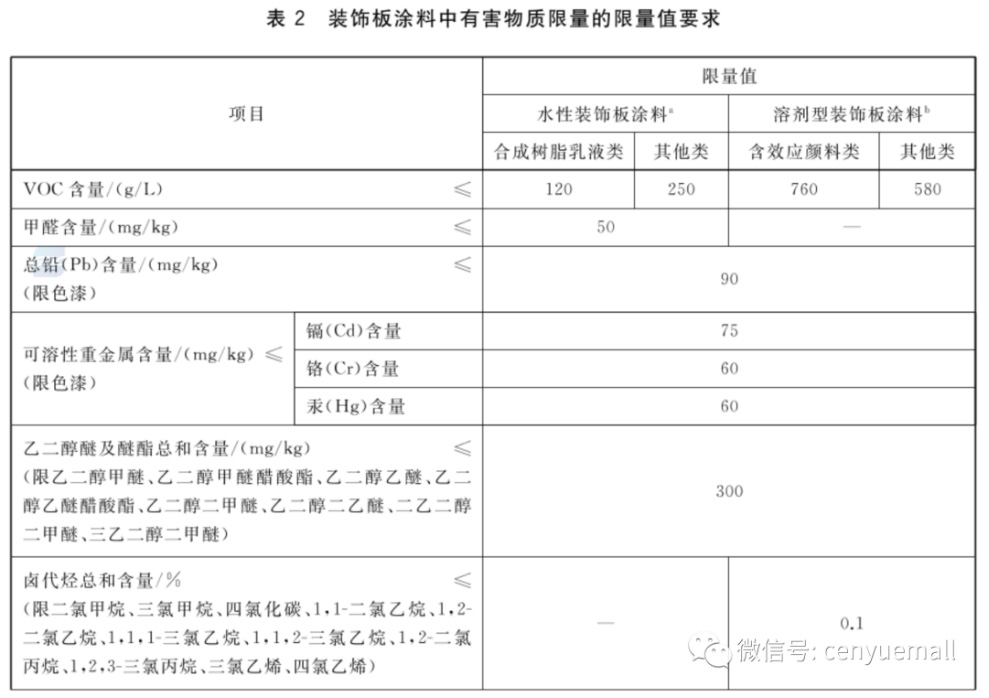 而像護(hù)墻板、吊頂、柜門一類裝飾板材用的涂料、顏料、油漆,就需要參照如下表中的限值要求了。